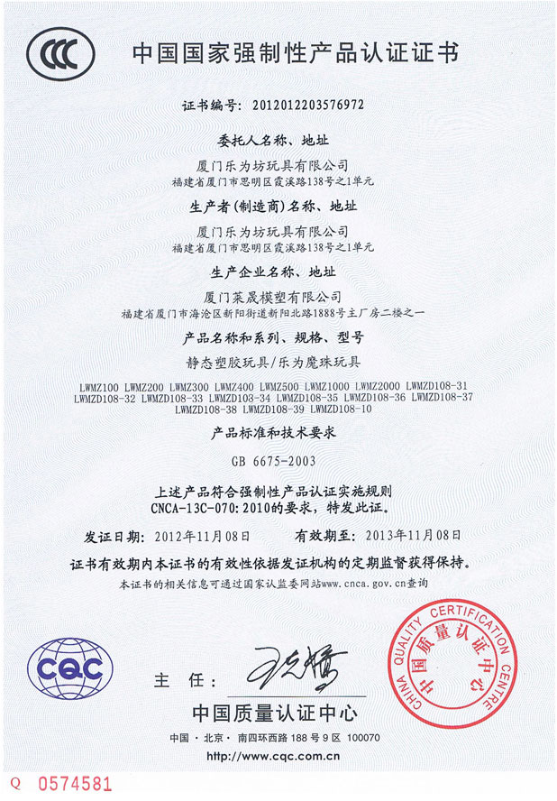 热烈祝贺乐为玩具通过3C认证!2012年11月08日乐为玩具(乐为塑菱、乐为魔珠)通过3C认证,这是乐为玩具发展中的又一重要时刻。乐为从诞生之日起就以国际品牌玩具的高品质要求自己,投入巨资,历时三年多研发过程,合作过两家OEM工厂,几经波折终于认识到初创玩具品牌要符合3C认证标准,要控制好玩具质量,应该有自己的生产工厂。因此,乐为股东高效率筹建了自己的第一家生产厂:厦门莱晟模塑有限公司,并作为乐为玩具OEM工厂顺利通过3C认证,从此,乐为玩具有了稳定的生产基地,开始正式迈入品牌营销阶段。